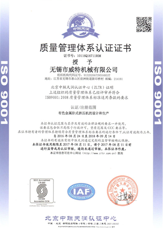 經過研發團隊多年來的努力,多個產品取得了高新技術產品榮譽稱號。公司研發團隊人員堅持不斷創新,將新技術運用于產品中,現有多個項目研發中。 公司視產品質量為生命,從原材料開始嚴格控制質量,過程中每一道工序的檢驗都有記錄,并通過了ISO9001質量體系認證,以過硬的質量確保出廠的產品... 二十多年來,我們所生產的2000余臺擠壓機暢銷國內及世界各地,如 法國美泰樂公司、美國UAC公司(波音、空客飛機主要型材供應商)、德國優美科、阿聯酋、巴西、阿根廷、土耳其、越南、墨西哥等。 公司以優質完善的服務為客戶的滿意提供了保障,我們將想用戶之想,超用戶之想,不斷提高服務品質。